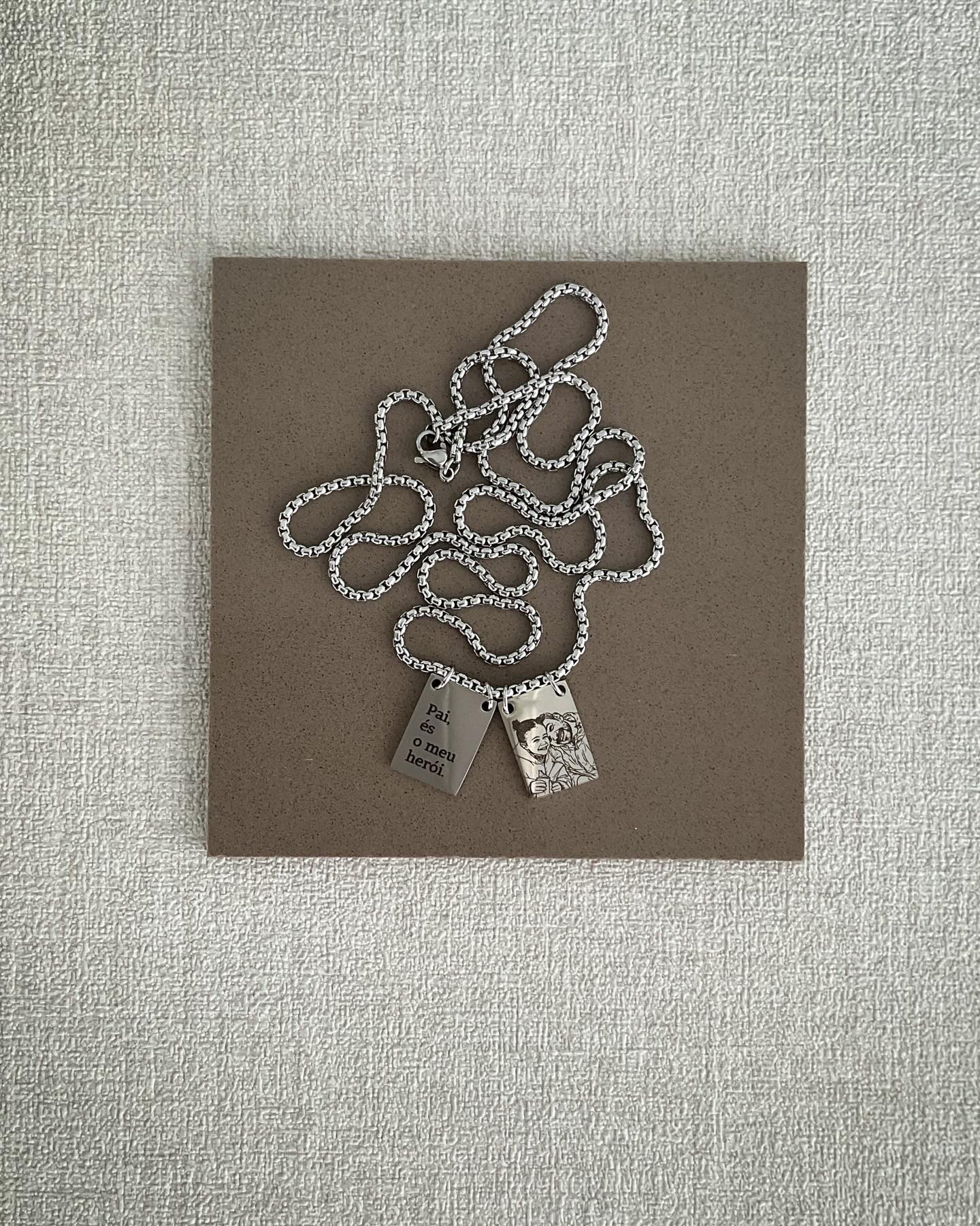 O colar inclui dois pingentes em aço inoxidável gravados a laser: um com a mensagem emocionante dedicada ao pai e outro com uma ilustração delicada de pai e filho, tornando este acessório único e especial.