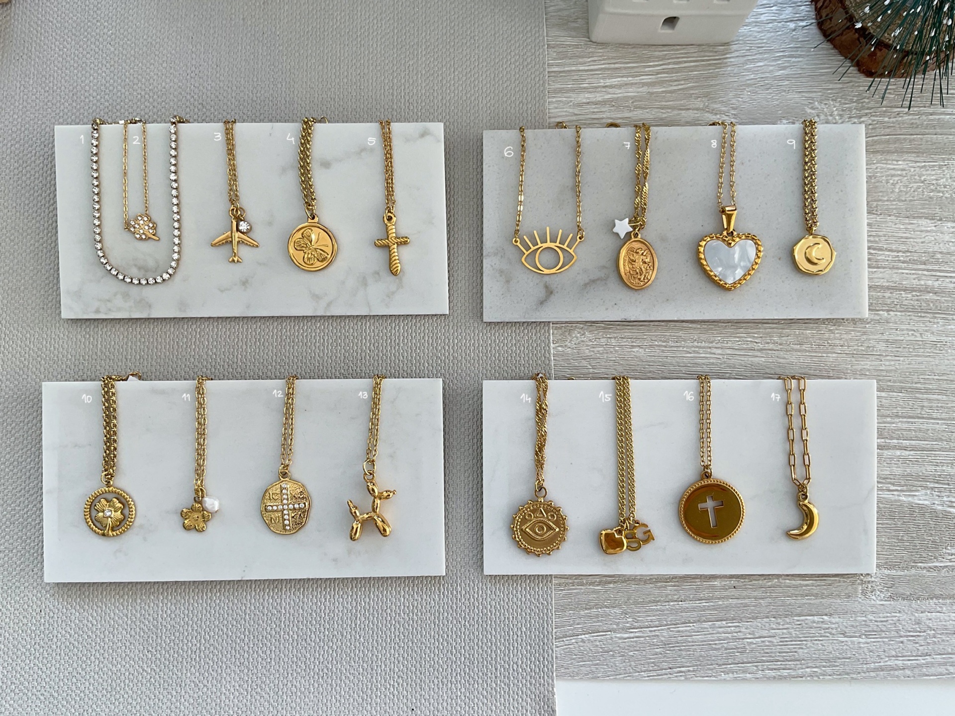 COLARES 13,50 € Desconto de %. Material: Aço Dimensões: 40cm + 5cm colar número 15 mede 60cm Ler mais Modelo 1 Brilhantes 2. trevo brilhantes 3. Avião 4. Borboleta 5. Cruz 6. Olho 7. S. Miguel Arcanjo 8. Coração madrepérola 9. Lua 10. Trevo 11. Flor 12. Cruz brilhantes 13. Cão 14. Olho 15. mini coração + 2 letras 16. Medalha cruz 17. Lua Quantidade Comprar Contactar Tags colarespresentes Natal Características Partilhar