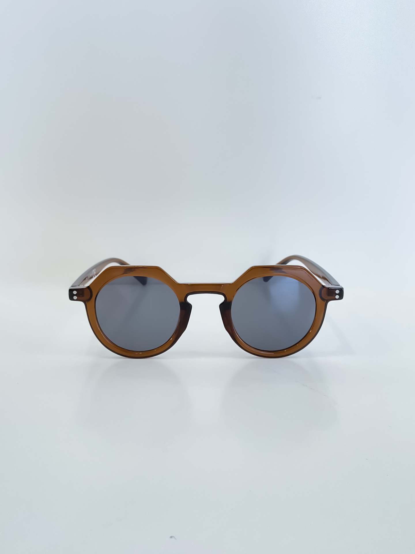 A armação em tom quente combina com as lentes escuras para um visual equilibrado e cheio de personalidade.