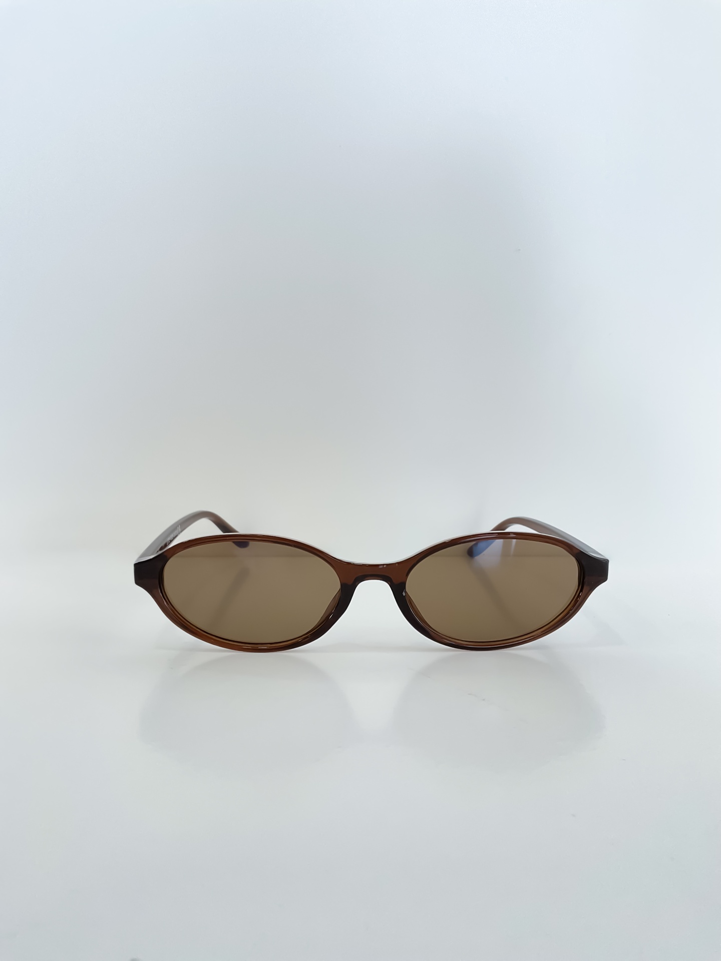 A forma oval e a armação em tons castanhos criam um look intemporal e versátil.